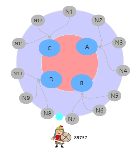 那么这名士兵属于哪个节点管控呢?如下图所示,士兵顺时针往前走,先走到了 D 节点,所以属于 D 节点管控。虽然还是属于第三组,但是这名士兵的领导者已经变了:由 C 变成了 D。