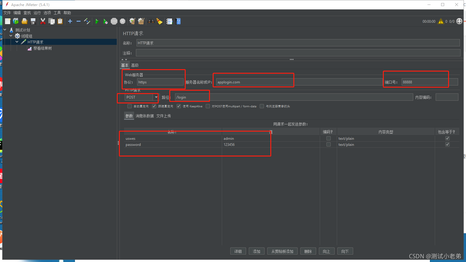 Let's say I have one post request , The port number is 88888 Of login Interface :https://applogin.com/login. He needs to pass 2 Parameters , One is users, The other one is password. The picture below is in jmeter Request settings on .