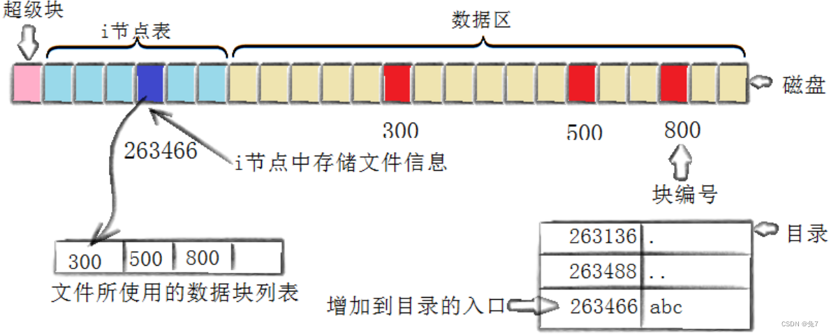 文件内容按顺序300,500,800存放。内核在inode上的磁盘分布区记录了上述块列表。- 添加文件名到目录