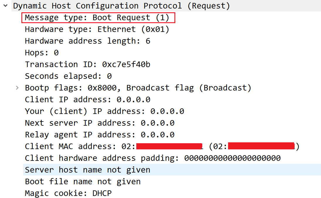 这是客户端的MAC地址,你会发现Discover、Offer、Request、Ack这几条消息,都把这个字段填上了客户端的MAC地址