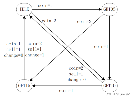 Draw the state transition diagram according to the design requirements , Determine the type of state machine to use , And mark various input and output signals , More helpful for programming . The most commonly used are Mealy type 3 Segmented state machine , The following describes the design process of the state machine by designing a specific example of an automatic vending machine .