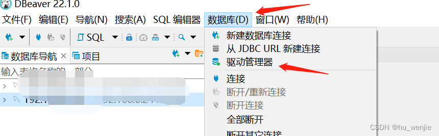 首先,在已下载驱动的DBeaver工具上复制驱动文件,入口菜单栏“数据库”–“驱动管理器” 进入