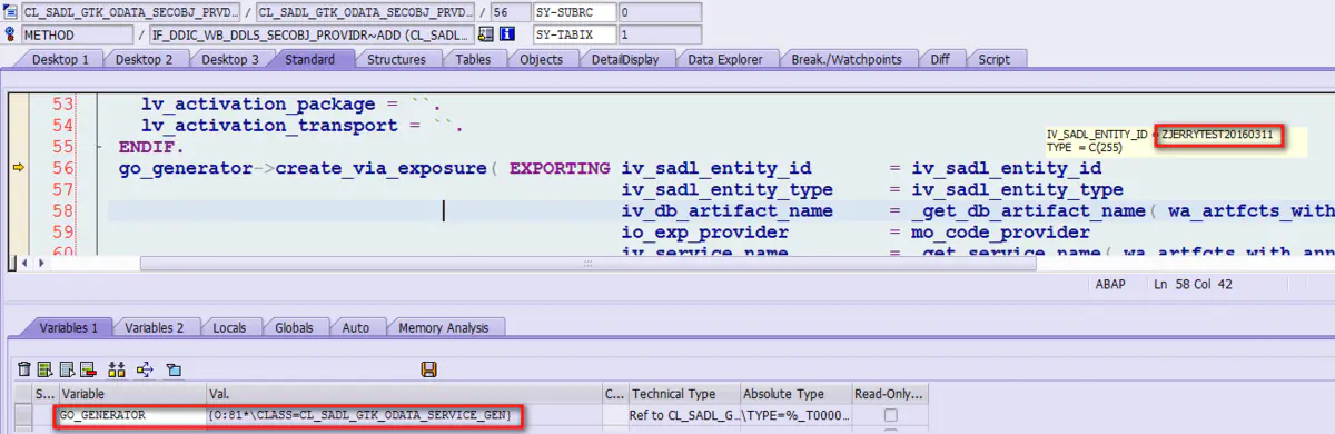 You can see from the debugger , The name is ZJERRYTEST20160311 Of OData Service pass create_via_exposure Method is created .