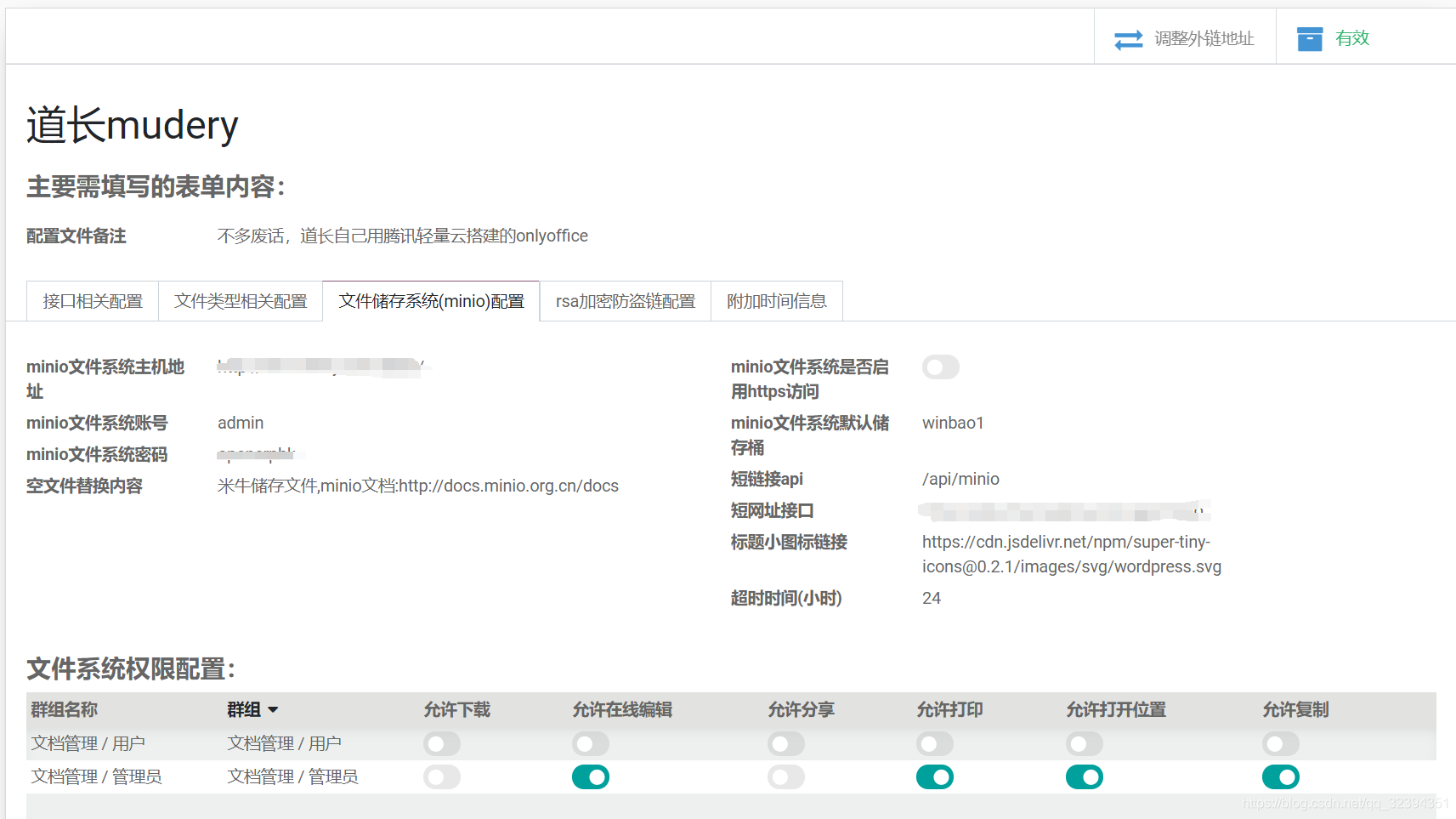 2. onlyoffice相关的配置,大概也需要搞个数据库表的字段来这样设置,至于怎么对接,前面说了参考官方python的demo,django代码通俗易懂