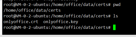 docker run --name=onlyoffice --restart=always --detach --publish=8033:443 --net mynet --ip 172.20.10.5 -v /home/office/log:/var/log/onlyoffice -v /home/office/data:/var/www/onlyoffice/Data -e LANGUAGE=zh_CN:zh -e JWT_ENABLED=true -e JWT_IN_BODY=true -e JWT_SECRET=secret -e DB_TYPE=postgres -e DB_HOST=172.20.10.1 -e DB_PORT=5432 -e DB_NAME=onlyoffice -e DB_USER=onlyoffice -e DB_PWD=onlyoffice -e AMQP_URI=amqp://guest:[email protected]:5672 -e REDIS_SERVER_HOST=172.20.10.9 -e REDIS_SERVER_PORT=6379 hjdhnx/onlyoffice:210425这样容器启动后,你在宿主机 /home/office/data目录里面执行操作,创建certs目录mkdir certs将自己已有的https证书私钥文件和公钥文件拷贝进certs目录