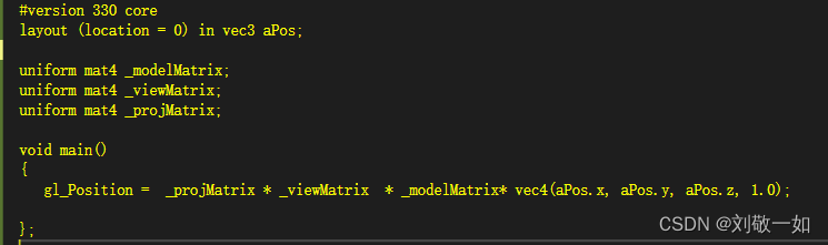 收获:其实着色器读取数据是十分灵活的,比如顶点属性的原生数据有纹理,位置,颜色的数据的时候,但是我可以在顶点着色器中只接收我可能会用到的数据。比如光源立方体的顶点着色器中只接收了位置信息并且在渲染时我也不用对其他用不到的属性信息进行处理。