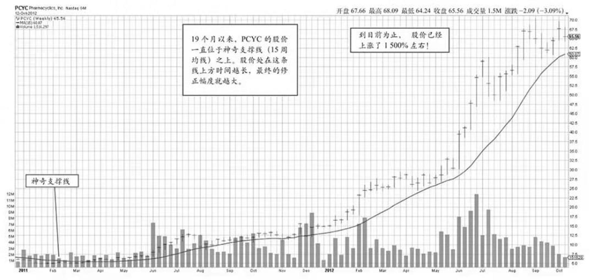 盈利公布后,该股票的基本面发生了明显的改善,成交价跳空收盘后形成的缺口与其说是一个技术面支撑位,不如说是一个基本面的支撑位,了解内情的投资者投资者会牢牢守住这一个缺口。2 ~ 3 周是安全买入时机,在这个买入周期内,超级趋势股会持续呈现几周的安静期,同时成交量也会持续下降。
