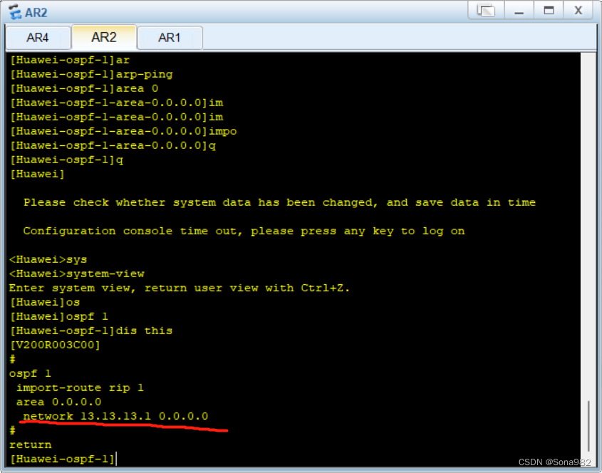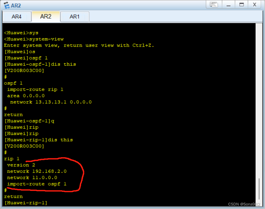然后,需要在AR2和AR4上建立多点双向重发布,因为日志过多,我将指令手写给大家