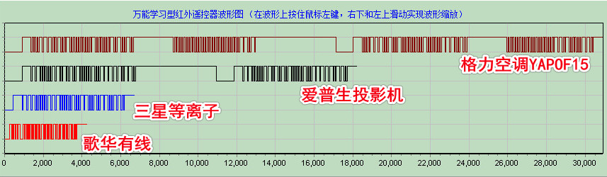 通过测试软件,可以很方便的学习到红外遥控器按键编码数据,为了调试方便,测试软件可以学习四个通道的数据,解码数据会通过波形显示出来,波形可以任意缩放,可以较直观的分析采集到的红外编码数据。