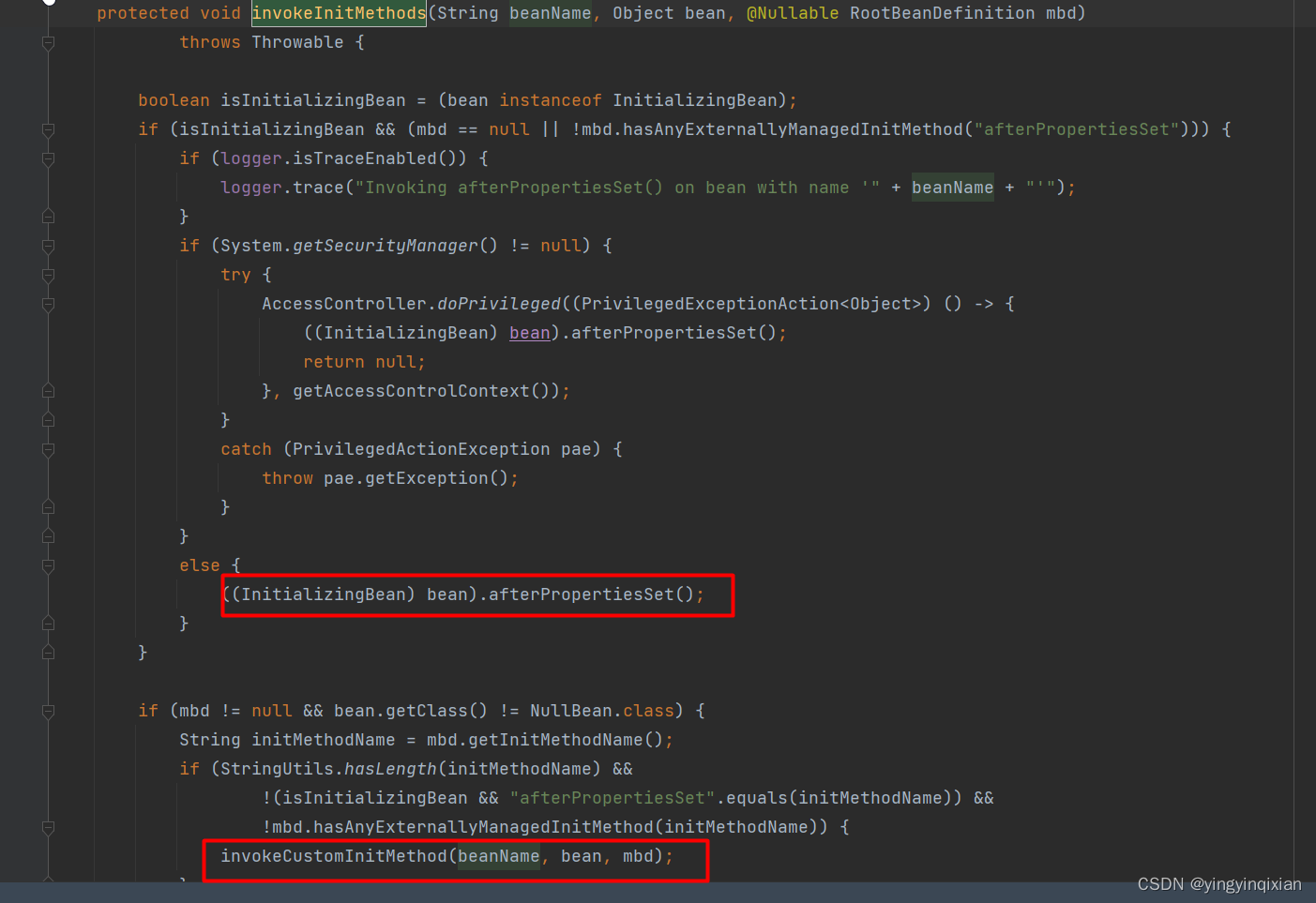 当一个类实现这个接口之后,Spring启动后,初始化Bean时,若该Bean实现InitialzingBean接口,会自动调用afterPropertiesSet()方法,完成一些用户自定义的初始化操作,在BeanFactory初始化完这个bean,并且把bean的参数都注入成功后调用一次afterPropertiesSet()方法,InitializingBean有个功能类似在XML配置文件中配置init-method,afterPropertiesSet()在init-method之前调用,查看AbstractAutowireCapableBeanFactory类中invokeInitMethods方法。类似接口还有SmartInitializingSingleton
