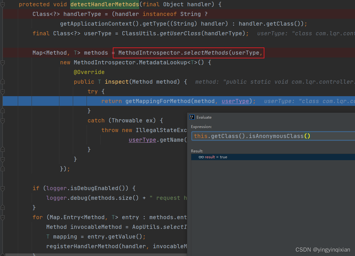 MethodIntrospector.selectMethods方法传递2个参数,第一个参数字节码,第二参数MetadataLookUp是函数接口,@FunctionalInterface修饰类似接口还有Consumer和Function,java8提供了许多这样的函数接口,当然也可以自定义实现,inspect方法会在selectMethods调用时执行,通过this.getClass().isAnonymousClass()可以判断出是否是匿名内部类,实现接口的匿名类,语法格式:new <父类或接口> <类>,这里的好处是代码复用,MethodIntrospector是一个抽象类提供一套通用实现,子类继承可通用此方法,不同的实现在子类实现,类似功能还有抽象方法子类实现、函数接口回调等,此种场景属于函数回调;进入MethodIntrospector类selectMethods方法,返回map