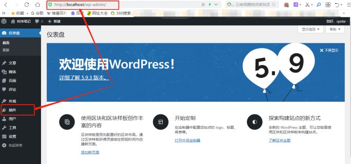 Because our local web pages rely on WordPress The establishment of a , So we can also go through WordPress plug-in unit , And then generate a standard URL. First, we enter... In the address bar of the browser “http://localhost/wp-admin”, Get into WordPress Setting interface of , And click on the left “ plug-in unit ” tab .