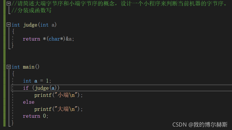 这题的话我们可以初始化变量为1,然后去判断先存放的是1还是0,是1则为小端存储,反之为大端存储。代码如下
