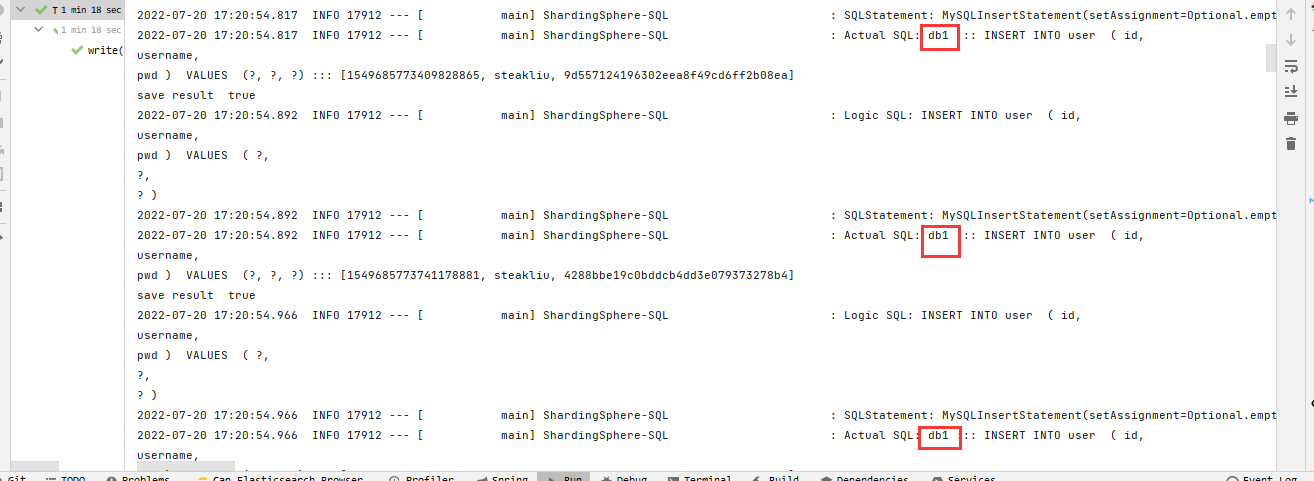因为写操作配置的数据库是db1,所以所有写操作都应该进入db1,如下图所示,解析出来的ShardingSphere-SQL中显示的都是db1。
