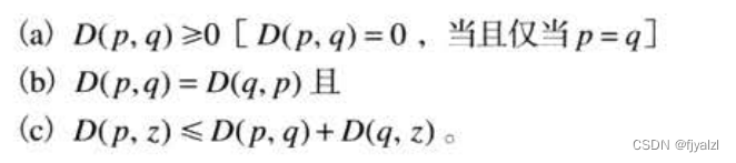 对于距离度量,距点(x,y)的距离小于或等于某个值r的像素是中心在(x,y)且半径为r的圆平面。p和q间的距离D4(又称为城市街区距离)由下式定义: