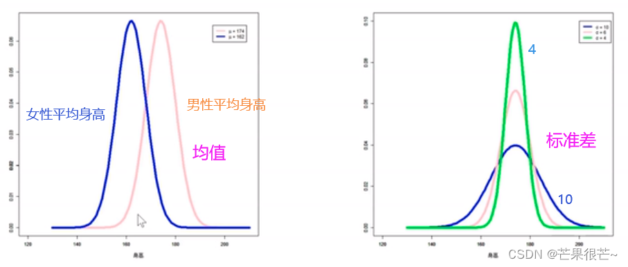 Normal distribution / Gaussian distribution curve Like a mountain peak , The height is steep and gentle ,( Middle high , On both sides of the low , Symmetrical on both sides ). It's determined by two parameters : mean value μ( Represents the average level of data )、 Standard deviation σ( Represents the degree of dispersion of data , The greater the standard deviation , Some values are far from the average , The more discrete , The slower the mountain grows ; The smaller the standard deviation , The value is close to the average , More agglomeration , The steeper the mountain .)