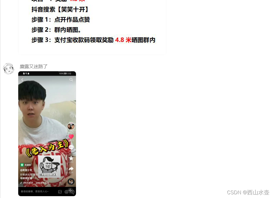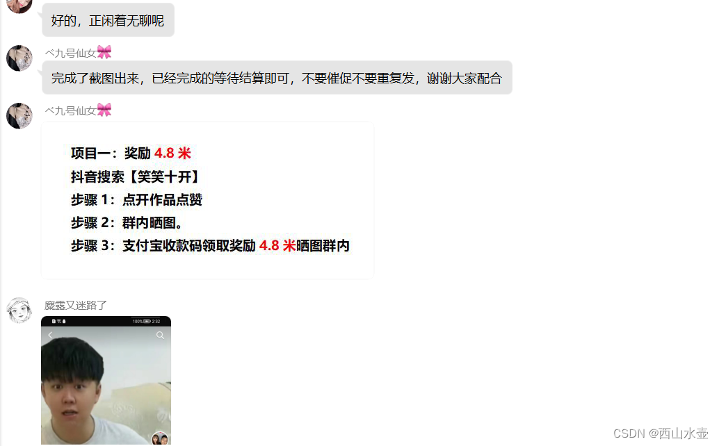 The task is very simple , As long as you like the designated account on Tiktok, you can earn 4.8 element , Sure enough , Immediately someone replied that they had completed the task , And cut the picture .