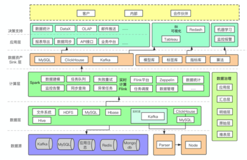 Take a look at the plan of bitland , Its scheme type is scheme 3 The standard layered embodiment of + Flow calculation + Batch calculation , It also introduces ClickHouse, It can be seen that the data scheme of bit continent is very complex :