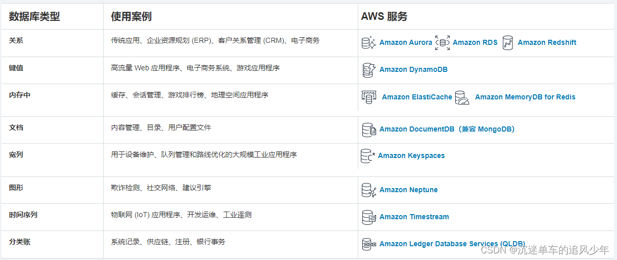 亚马逊数据库提供了覆盖面极广的服务,包括内容管理、企业资源管理、设备维护等,如下图所示: