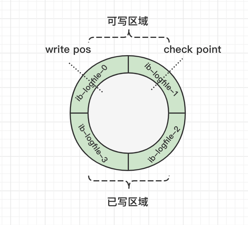采用循环写入覆盖的方式,write pos记录开始写的位置,向后移动。checkpoint记录将要擦除的位置,也是向后移动。write pos到checkpoint之间的位置,是可写区域,checkpoint到write pos之间的位置是已写区域。
