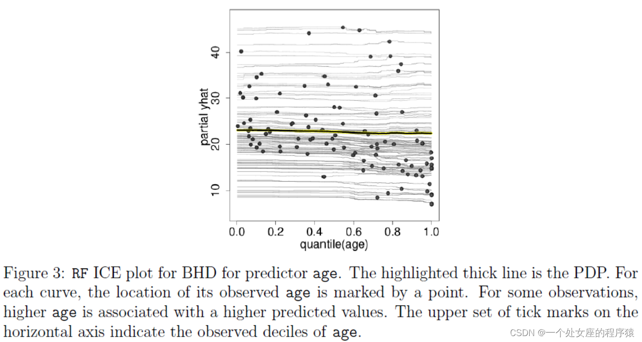 | chart 3: Used to predict age BHD Of RF ICE chart . The highlighted thick line is PDP. For each curve , The position of the observed age is marked by a dot . For some observations , Higher age is associated with higher predictive values . A set of scale lines on the horizontal axis represent the observed age deciles . |
