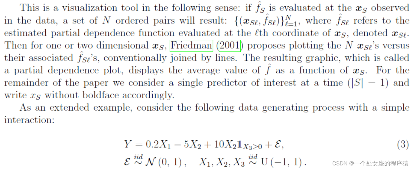 This is a visualization tool in the following sense: if ^ fS is evaluated at the xS observed in the data, a set of N ordered pairs will result: f(xS`; ^ fS`)gN `=1, where ^ fS` refers to the estimated partial dependence function evaluated at the `th coordinate of xS, denoted xS`. Then for one or two dimensional xS, Friedman (2001) proposes plotting the N xS`'s versus their associated ^ fS`'s, conventionally joined by lines. The resulting graphic, which is called a partial dependence plot, displays the average value of ^ f as a function of xS. For the remainder of the paper we consider a single predictor of interest at a time (jSj = 1) and write xS without boldface accordingly.As an extended example, consider the following data generating process with a simple interaction: | Predictive variables S Each subset of has its own partial dependency function fS, It gives when xS Fixed and xC In its marginal distribution dP (xC) When it changes f Average value . Because I don't know the real f I don't know. dP (xC), We estimate the equation by calculation 1 among fxC1; :::; xCNg Indicates the difference observed in the training data xC value . Please note that , The approximation here is double : We use it ^ f Estimate the real model , Output of statistical learning algorithm , What we have observed intensively through training N individual xC Values are averaged to estimate xC Integral on . This is a visualization tool in the following sense : If observed in the data xS Evaluate ^fS, Then a set of N An orderly pair of :f(xS`; ^fS`)gN`=1, among ^fS` Referring to xS The estimated partial dependence function evaluated at the coordinate of , Expressed as xS. Then for one or two dimensions xS,Friedman (2001) It is recommended to draw N xS`'s Associated with them ^fS`'s, Usually connected by wires . The generated graph is called local dependency graph , take ^ f The average value of is shown as xS Function of . For the rest of this article , We consider one predictor of interest at a time (jSj = 1), And write accordingly without bold xS. As an extension example , Consider the following data generation process with simple interaction : |