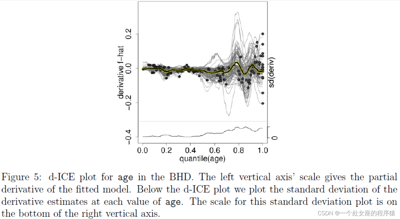 | chart 5:BHD Middle aged d-ICE chart . The scale of the left longitudinal axis gives the partial derivative of the fitting model . stay d-ICE At the bottom of the picture , We plotted the standard deviation of the derivative estimates for each age value . The scale of this standard deviation diagram is located at the bottom of the right vertical axis . |