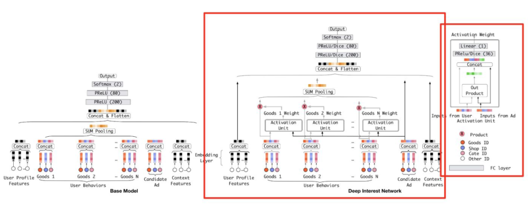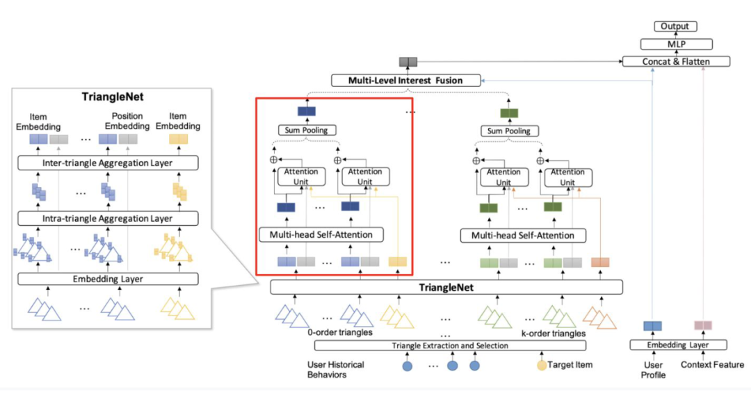 TGIN 的模型结构如下图,看着复杂,其实很简单。下图中的红框部分就是一个类似于 DIN 的计算 attention 的网络,左边是处理 triangle 的,有边是计算多阶 triangle(理解为图上的多阶邻居)attention 的网络。