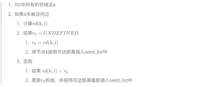 可达距离:给定的领域半径和密度内,在核心距离外同时在领域半径内的点的距离。