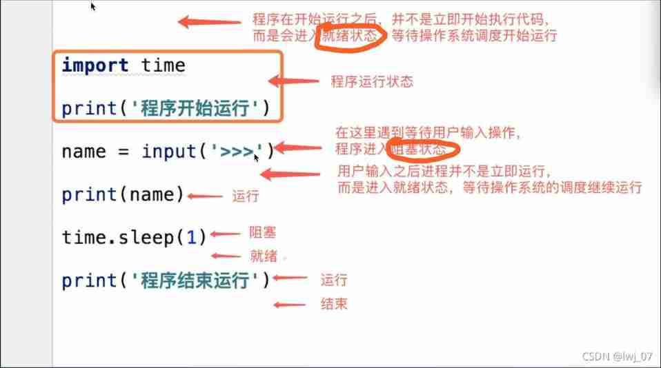 Be careful : In the blocking state, if the program stays idle that cpu It will be taken away and used by other programs , The program in the block needs to enter the ready state again and wait for the newly allocated cpu
