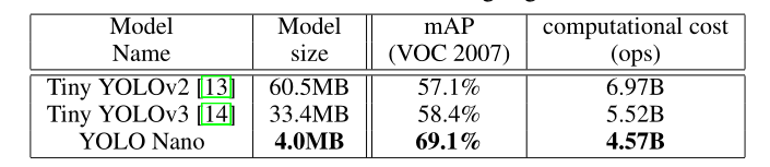 表1显示了所提出的YOLO纳米网络以及微小YOLOv2和微小YOLOv3的模型大小和目标检测精度。首先,我们观察到YOLO Nano的模型大小为4.0MB,分别比Tiny YOLOv2和Tiny YOLOv3小15.1×和8.3×以上,这对于考虑内存限制的边缘和移动场景非常重要。其次,YOLO Nano虽然模型尺寸小得多,但在VOC 2007测试数据集上实现了69.1%的映射,分别比Tiny YOLOv2和Tiny YOLOv3高出12%和10.7%。第三,YOLO Nano只需要45.7亿次运算就可以进行推断,比微小的YOLOv2低34%,比微小的YOLOv3低17%。