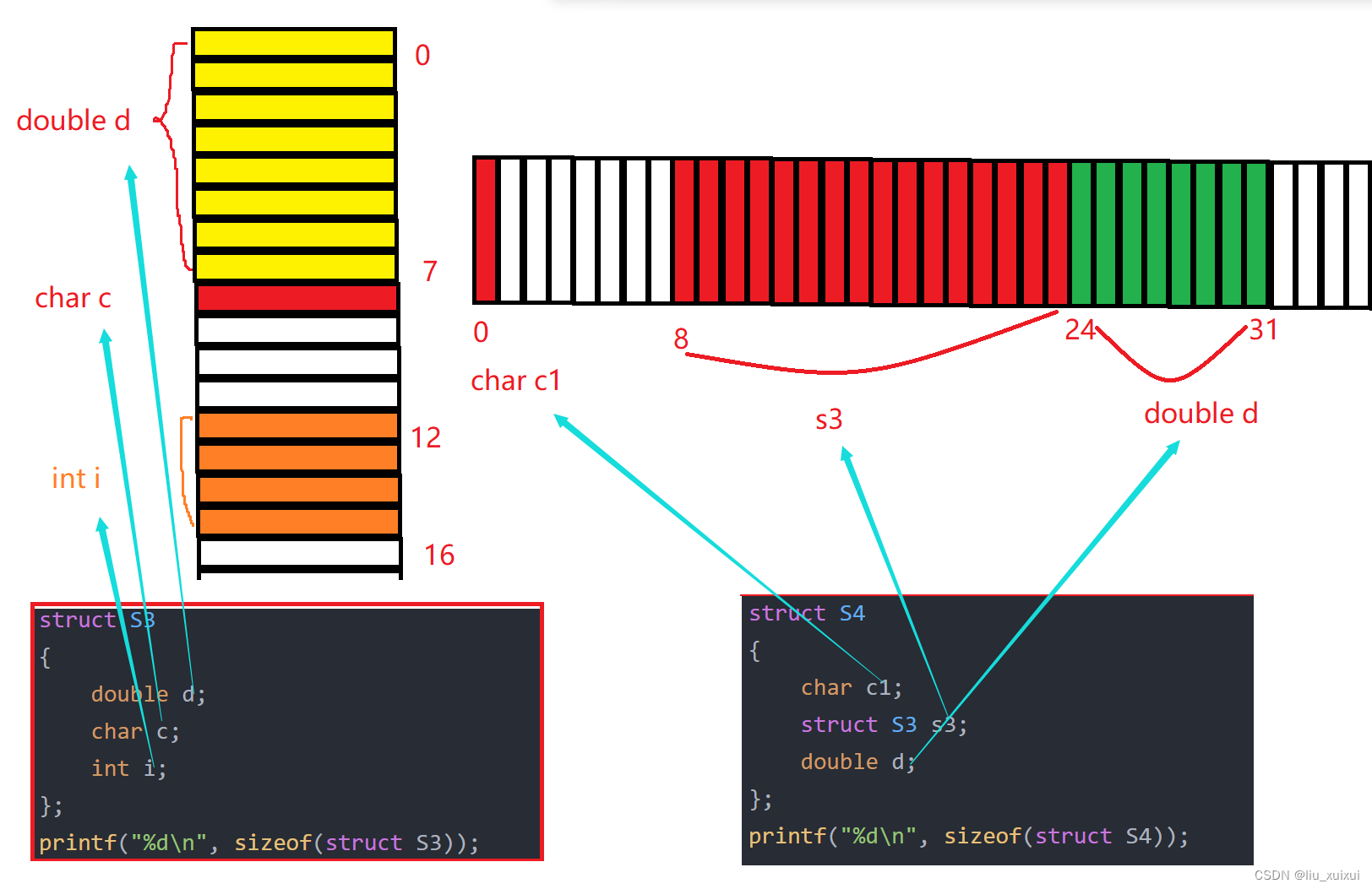 4.如果嵌套了结构体的情况,嵌套的结构体对齐到自己的最大对齐数的整数倍处,结构体的整体大小就是所有最大对齐数(含嵌套结构体的对齐数)的整数倍。