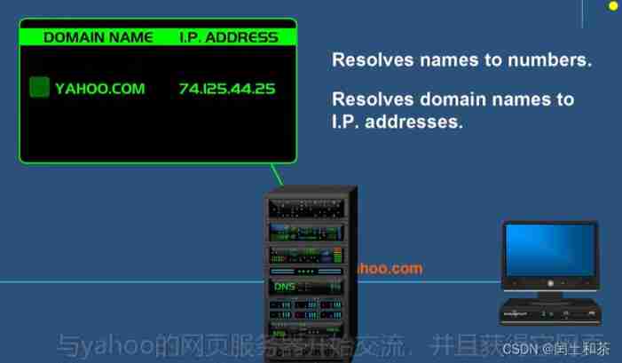 Strictly speaking , You don't have to type yahoo.com To get yahoo The web page of , You can type IP Address , If you already know . But because we are not good at remembering and processing numbers , Especially when there are thousands of Web sites on the Internet , We can enter the domain name directly , And then let DNS Help us transform into IP Address .