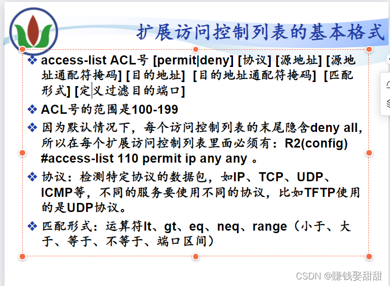 - 扩展访问列表既检查数据包的源地址,也检查数据包的目的地址,还检查数据包的特定协议类型,端口号等