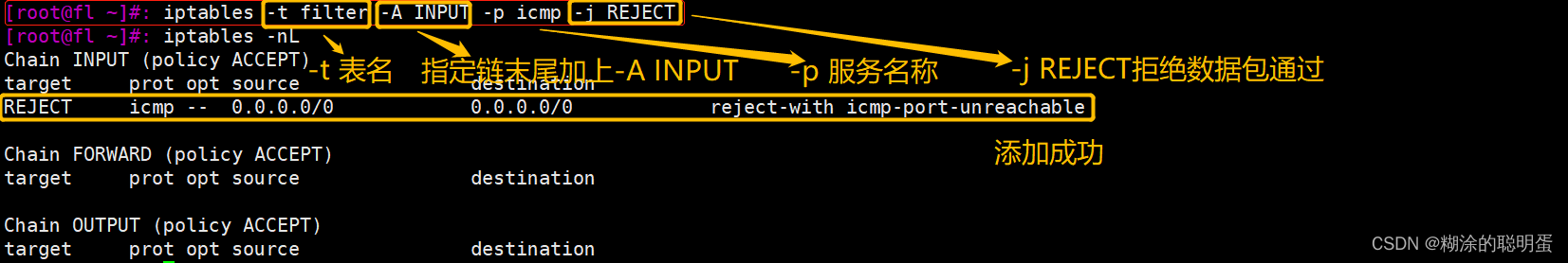 for example , If you want to be in filter surface INPUT Add a firewall rule at the end of the chain , You can do the following ( among “-p The name of the agreement ” As a matching condition ).