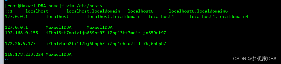 Step3 : 因为默认云服务器默认主机名都是一大串数字并不好操作,建议修改一下服务器主机名: vim /etc/hostname 我这里改成 MaxwellDBA(下面会用到该主机名) 同时在 vim /etc/hosts 文件中加上自己的主机名,上面第一个红色框是我云服务器的ip地址。