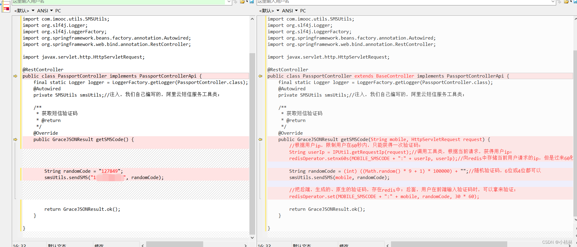 package com.imooc.user.controller; import com.imooc.api.BaseController; import com.imooc.api.controller.user.PassportControllerApi; import com.imooc.grace.result.GraceJSONResult; import com.imooc.utils.IPUtil; import com.imooc.utils.SMSUtils; import org.slf4j.Logger; import org.slf4j.LoggerFactory; import org.springframework.beans.factory.annotation.Autowired; import org.springframework.web.bind.annotation.RestController; import javax.servlet.http.HttpServletRequest; @RestController public class PassportController extends BaseController implements PassportControllerApi { final static Logger logger = LoggerFactory.getLogger(PassportController.class); @Autowired private SMSUtils smsUtils;// Inject , We wrote it ourselves , Alibaba cloud SMS service tools ; /** * Get SMS verification code * @return */ @Override public GraceJSONResult getSMSCode(String mobile, HttpServletRequest request) { // According to the user ip, Limit users to 60 Seconds , Only one verification code can be obtained ; String userIp = IPUtil.getRequestIp(request);// Call the tool class , Based on current request , Get users ip; redisOperator.setnx60s(MOBILE_SMSCODE + ":" + userIp, userIp);// towards redis Stores the current user requested ip, But come here 60 Seconds later , This data will time out and disappear ; String randomCode = (int) ((Math.random() * 9 + 1) * 100000) + "";// Random verification code ,6 Bit or 4 All positions are OK smsUtils.sendSMS(mobile, randomCode); // Back end , Generated 、 Native verification code , There is redis in ; Back , When the user enters the verification code at the front end , Can be used to verify ; redisOperator.set(MOBILE_SMSCODE + ":" + mobile, randomCode, 30 * 60); return GraceJSONResult.ok(); } }explain :
