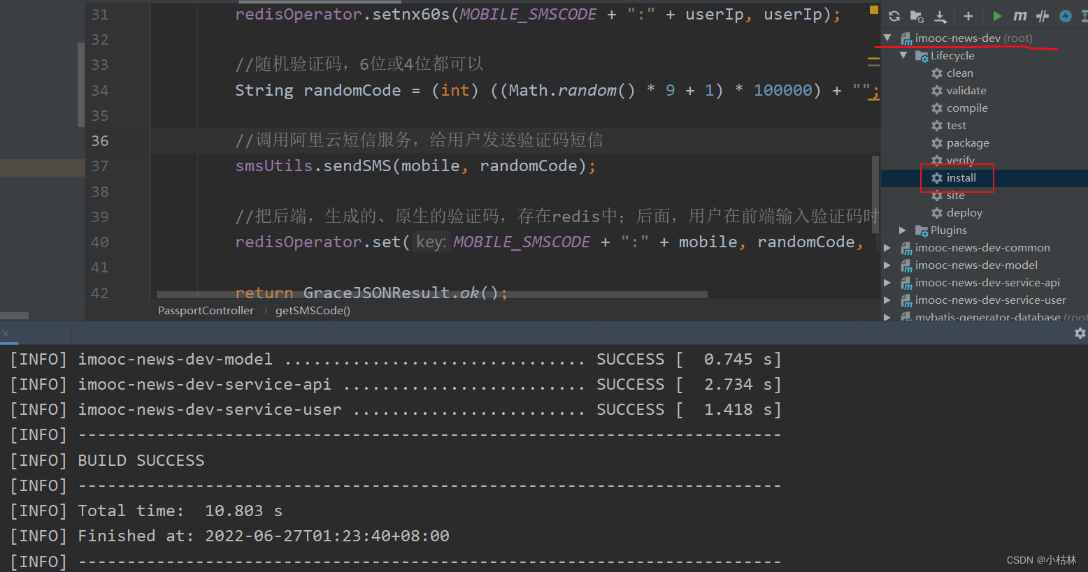 ● First , stay 【imooc-news-dev-api】 Interface engineering , Defined a 【 Send a text message , Interface 】getSMSCode();