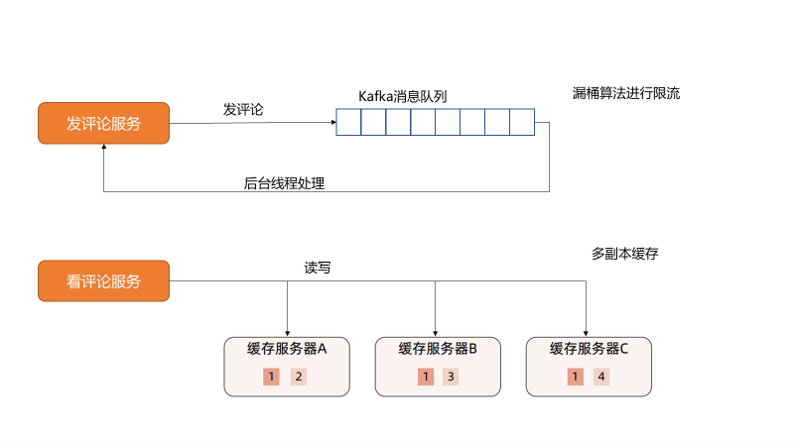 - 发评论:发评论不如发微博重要,且有很多评论不需要即刻被看到,可以考虑使用限流的方式保护系统。同时评论能够增加讨论度,活跃社区气氛,带来更好的传播效果,所以不应该被丢弃,可以考虑漏桶算法,通过一个kafka消息队列来实现写缓冲。