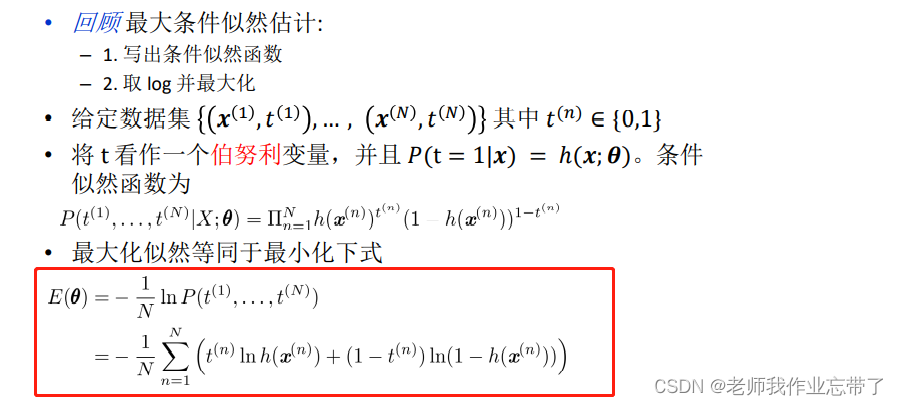 For Bernoulli distribution , We maximize conditional data likelihood , Getting is equivalent to minimizing :