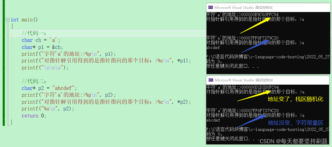 (1) character 'a' Storage location : Code 1 Medium 'a' Store in the stack area , Code 2 Medium 'a' Stored in the character constant area ( The screenshot below can prove )