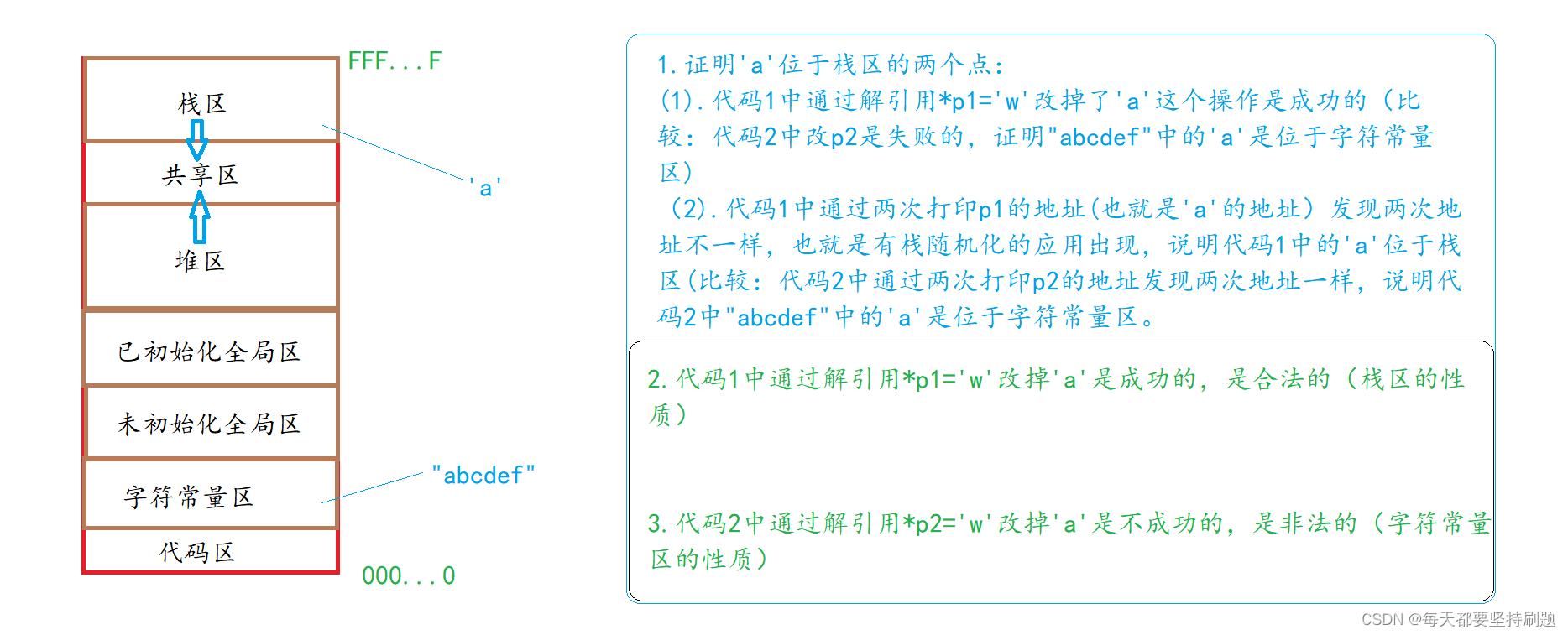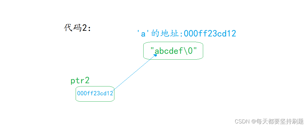 Mistake code 2 in p2 Pointer variables store strings , actually p2 It points to a string "abcdef” First character in 'a' The address of ( For two reasons :1. Pointer variable in x86 position (32 Under the machine ) yes 4 Bytes , however "abcdef“ Yes 7 Characters , A pointer can hold only one address ;2. Print out by pointer dereference 'a'), And because of the string "abcdef" In the memory ( Character constant area ) The space in is continuous , So just get the first element of the string 'a' Can access the contents of the entire string .