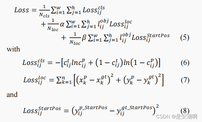 Loss: Three kinds of predicted values output by the model , Confidence of lane line confidence, Offset of lane line point \triangle x(x-coordinate), Starting point of lane line y(y-coordinate), Correspondingly ,loss Function is also composed of these three parts , Of confidence loss Using cross entropy , The loss function of lane line points uses Euclidean distance .loss function As shown in the figure below :