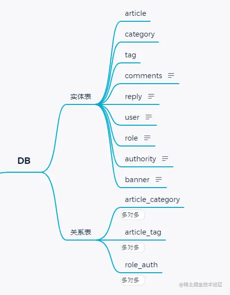 Among them, the article table article Is the core , Consider that an article may be associated with multiple categories category Or tags tag, There will also be multiple articles under a category or label , So all my designs here are Many to many relationship , A relational table is used .