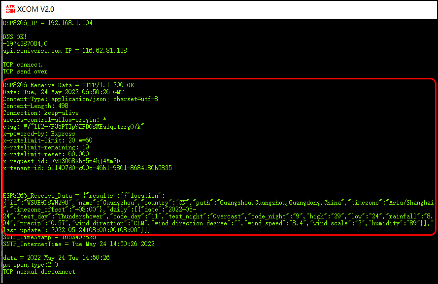 这下没问题了,可以开始下一步在ESP8266上发送GET请求并接收数据了,唉,折腾,13:31了,看看之前那个调试工具收到的HTTP响应报文还是11:44,煮饭去,肚子痛;