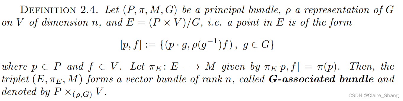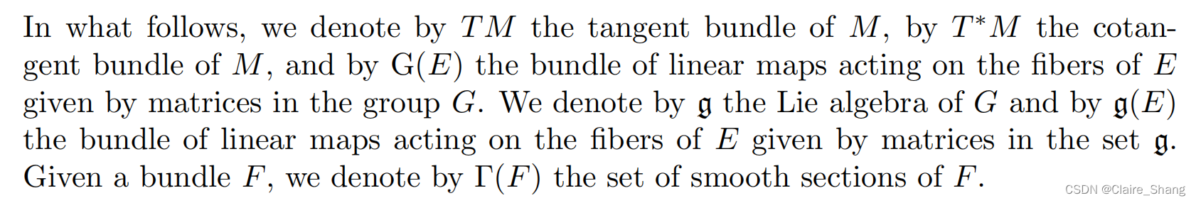 Next , We use it TM Express M Tangent bundle of , use T * M Express M Cotangent bundle of , from G(E) Be affected by G Given by matrix in group E The linear mapping bundle on the fiber .