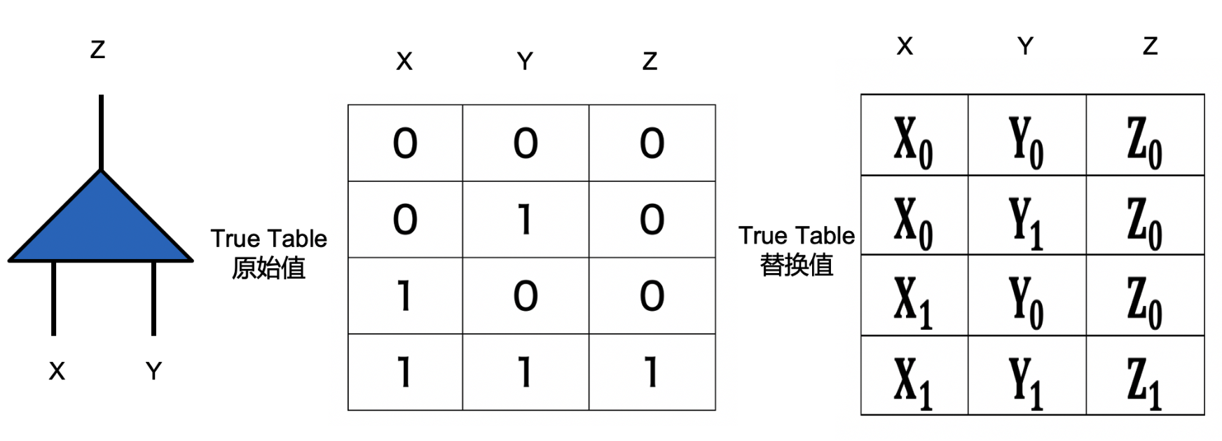 then ,Alice Conduct circuit Truth Table Replace ( Replace the real value with the replacement value , Hide the real value ), For example, the input representative X=0, Input representative X=1, Input representative Y=0, Input representative Y=1, Output representative Z=0, Input representative Z=1( These values , We call it replacement value , Random generation , Irregular ; The original input is called the true value ).