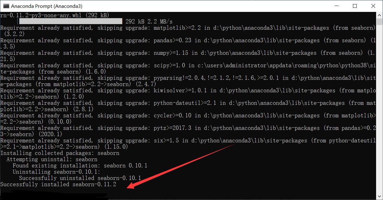解决方法:更新一下 seaborn 库,在 Anaconda Prompt 下输入 pip install -U seaborn 即可: