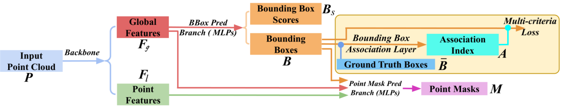 Bounding box prediction branch is the core of our framework . This branch is intended for single forward Each instance in the phase predicts a unique 、 Directionless rectangular bounding box , Instead of relying on predefined spaces anchors Or area proposal The Internet [39]. Pictured 2 Shown , We think it is a rough drawing for the example 3D Bounding boxes are relatively realizable , Because the input point cloud explicitly contains 3D Geometric information , It is very useful before dealing with point level instance segmentation , Because a reasonable bounding box can ensure the high goal of the learning segment . However , The learning example box covers key issues :1) The total number of instances is variable , From 1 To many ,2) There is no fixed order for all instances . These problems pose great challenges to the correct optimization of the network , Because there is no information that can directly link the prediction box to ground truth Tags are linked to monitor the network . however , We showed how to solve these problems gracefully . This box prediction branch simply takes the global eigenvector as input , And directly output a large number of fixed number of bounding boxes and confidence scores . These scores are used to indicate whether the box contains valid instances . To monitor the network , We design a novel bounding box correlation layer , Then there is a multi standard loss function . Give a group ground-truth example , We need to determine which prediction box is best for them . We express this association process as an optimal assignment problem with existing solvers . After the box is best associated , Our multi criteria loss function not only minimizes the Euclidean distance of the pairing box , And it maximizes the coverage of effective points in the prediction frame .