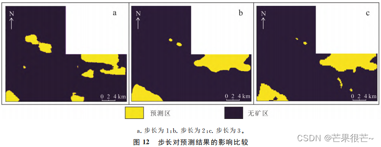 The step size in the convolution layer indicates how many lattices the convolution kernel moves at a time . contrast 3 The prediction results of three steps , It is found that the step size increases , The precision of prediction results is reduced . Comparative geological map 、 Geochemical element anomaly map and aeromagnetic anomaly map can , When the step length is 1 It has more credibility .